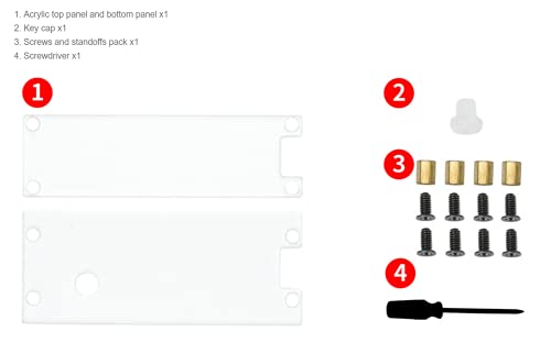 - 【Package Content】Acrylic top panel and bottom panel x1, Key cap x1, Screws and standoffs pack x1, Screwdriver x1