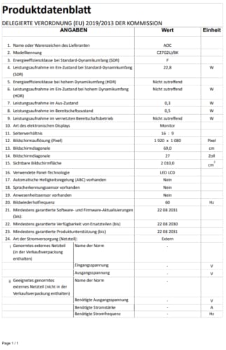 - Lieferumfang: AOC C27G2U Monitor 68,6 cm (27 Zoll) schwarz, Stromkabel, HDMI, Displayport, Treiber-CD, Garantiekarte