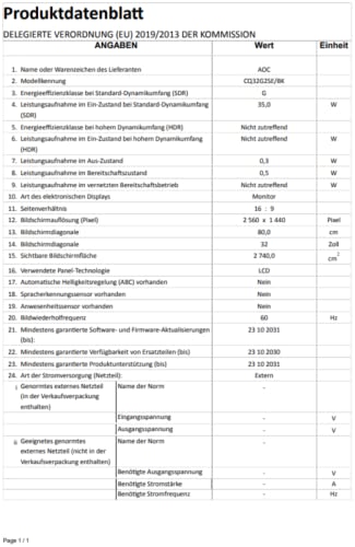 - Lieferumfang: AOC Gaming CQ32G2DE/BK Monitor 80 cm (31,5 Zoll) schwarz, Stromkabel, HDMI, Displayport, Treiber-CD, Garantiekarte