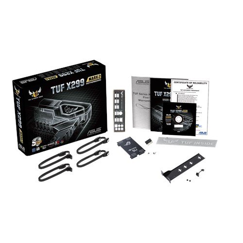 - Lieferumfang: Asus TUF X299 Mark 2, Nutzerhandbuch, Asus Q-Shield, vertikale M.2-Klammern, 4x SATA 6Gb/s Kabel, M.2 Schraubenset, Support-DVD, 2-Way SLI HB Bridge, TUF Garantieschein