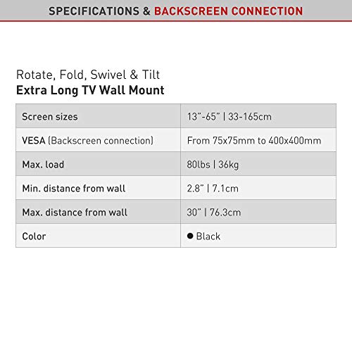 - ► SPART WERTVOLLEN PLATZ - Unsere universale TV Wandhalterung lässt sich in der Ausgangsposition hält bis 7.1cm zu der Wand zurückziehen, um Platz zu sparen, und lässt sich ebenfalls maximal 76.3cm von der Wand ausfahren. Dadurch sparen Sie wertvollen Platz und verleihen Ihrem Haushalt ein schönes und gepflegtes Aussehen.