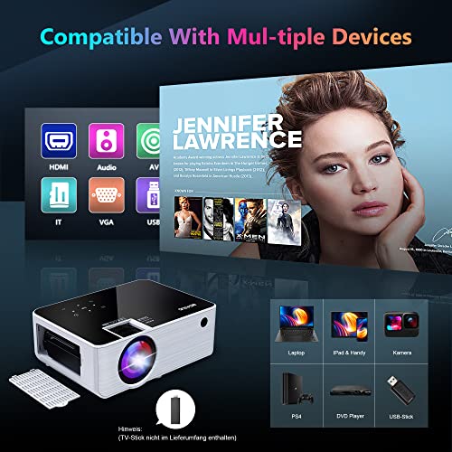 - 【Breite Kompatibilität & Einbau Slot für FireTV-Stick】Mit HDMI, VGA, AVund USB-Schnittstellen ist unser Filmprojektor kompatibel mit Laptops / PS4 / DVD-Playern / TV/ USB-Sticks / Android & IOS-Smartphone usw. Das Design mit Einbau Slot, ist ein perfekter Bereich, um einen FireTV-Stick oder ein anderes ähnliches Gerät anzuschließen und es über den USB-Anschluss daneben mit Strom zu versorgen. Und dann verstecken Sie alles, damit Sie sich keine Sorgen machen müssen, es zu verlieren!