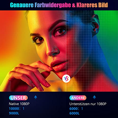- 【Verbesserte Helligkeit 60% & Farbdetails】Der native 1080P Full HD beamer ist mit einer hohen Helligkeit von 9000L und 10000: 1 Kontrastverhältnis ausgestattet. Dieser ist bis zu 60% heller, durch hochwertig beschichtete Objektive als andere ähnliche Heimkino-Projektor. Die Kombination von fortschrittlicher Farbtechnologie bringt eine saubere und genauere Farbwiedergabe, detaillierte HD Bildqualität und ein immersives Heimkino-erlebnis.
