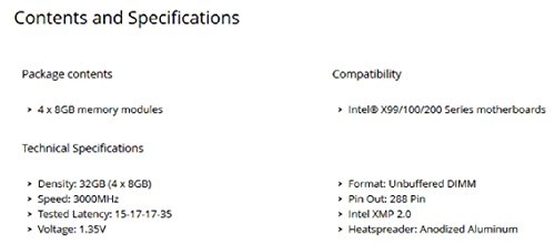4x 8GB Kit, RAM-Speicher: 32 GB, Interner Speichertyp: DDR4, Speichertaktfrequenz: 3000 MHz, CL15-17-17-35
