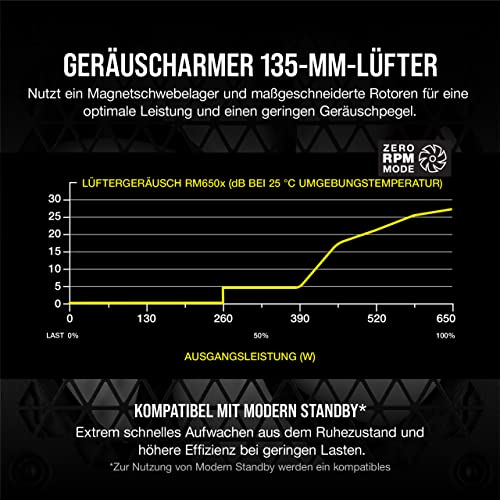 Corsair RM650x 80 PLUS Gold Vollmodulares 650 Watt ATX-Netzteil (135-mm-Lüfter mit Magnetschwebelager, Umfassende Kompatibilität, Japanische Kondensatoren, Extrem Schnelles Aufwachen) EU - Schwarz