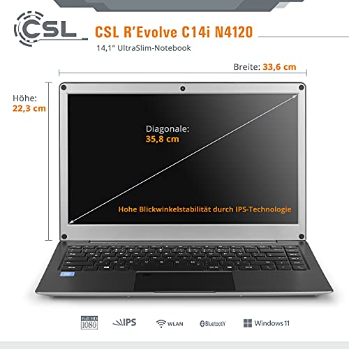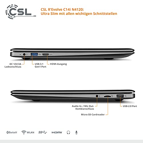 CSL R'Evolve C14i v2 inkl. Win11 Pro - Lautloses UltraSlim-Notebook mit 14,1" Full HD IPS-Display, Intel Quad-Core N4120 4× 2600 MHz, 120GB M.2 SSD, 4GB RAM, AC WLAN, Bluetooth 4.2, Windows 11 Pro