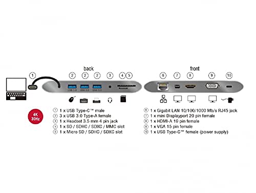 - Anschlüsse: Frontseite: 1 x Gigabit LAN 10/100/1000 Mb/s RJ45 Buchse 1 x mini Displayport 20 Pin Buchse 1 x HDMI-A 19 Pin Buchse 1 x VGA 15 Pin Buchse 1 x USB Type-C Buchse (Stromversorgung)