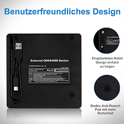 - ♫【Eingebettetes Design 】Mit dem in das CD laufwerk integrierten Kabel kann das Laufwerk problemlos in einer Tasche oder Schublade aufbewahrt werden. Das Gehäuse des DVD-Laufwerks hat 4 kleine Gummifüße, reduziert doppelte Vibrationen und verhindert ein Verrutschen auf glatten Oberflächen.
