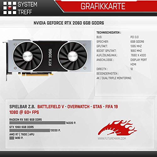 - Ihr individueller Systemtreff PC wird von einem Hexa-Core Prozessor der 9. Generation aus dem Hause Intel befeuert. Mit seinen Benchmark-Ergebnissen setzt er sich an die Spitze der oberen Oberklasse-Prozessoren.Gerade bei rechenintensiven Videospielen spielt eine echte Hexa-Core-CPU ihre Vorteile aus.Mit der eingebauten High-end Gamer Grafikkarte Nvidia GeForce RTX 2060 6GB GDDR6 verfügt ihr PC über genug Leistung um die aktuellsten Spiele in Full HD / 4K aufzulösen.