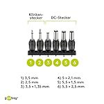 - Adaptergrößen: 2,5 mm Klinke, 3,5 mm Klinke, DC-Adapter (3,50 x 1,35 mm), DC-Adapter (5,00 x 2,10 mm), DC-Adapter (5,50 x 1,50 mm), DC-Adapter (5,50 x 2,50 mm)