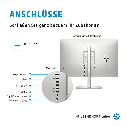 Select Variant: HP U28 Monitor - 28 Zoll Bildschirm, 4K UHD Display, HDR, 60Hz, 5ms Reaktionszeit, AMD FreeSync, HDMI 2.0, DisplayPort 1.2, USB-C, 3xUSB-A, Low Blue Light Modus, schwarz/silber