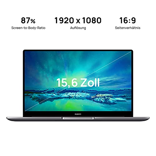 - Eye Comfort HUAWEI FullView-Display: Das 15,6 Zoll HUAWEI FullView IPS-Display und das 16:9-Seitenverhältnis bieten ihnen ein maximales Sichtfeld, während Bilder dank der Full-HD 1920 x 1080 Auflösung besonders detailgetreu und deutlich angezeigt werden. Das MateBook D15 wurde so konzipiert, dass es die Augen entlastet und Ermüdung entgegenwirkt – mit TÜV Rheinland-Zertifizierungen für Flimmerfreiheit und reduziertes Blaulicht. 87% Screen-to-Body-Verhältnis.