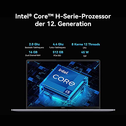 HUAWEI MateBook D16, 12th Intell Core i5-12450H Prozessor, 16 inch Eye Comfort HUAWEI FullView-Display, 16GB RAM, 512GB SSD, Fingerprint, Windows 11 Home, Super Device Funktion, QWERTZ, Space Gray