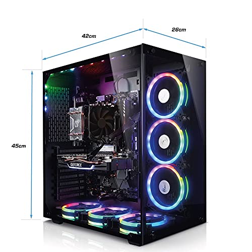 - Der Panorama Gamer-PC ist nicht nur ein optischer Blickfang, dank der 6 eingebauten Zusatzlüfter wird eine perfekte Kühlung realisiert. Das optische Highlight strahlt durch hochwertige Glasscheiben in jeder gewünschten Farbeinstellung. Sofort startklar - nur noch anschließen und loslegen.