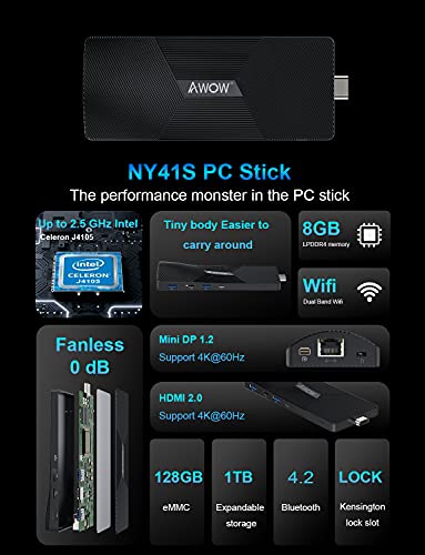 Lüfterloser 8GB Mini PC Stick Intel Celeron J4105, 128GB Speicher, Windows 10 Pro Mini Computer Stick mit Unterstützung für HDMI 2.0 und Mini DP 1.2 Dual 4K@60Hz, Gigabit Ethernet Port, AWOW NY41S