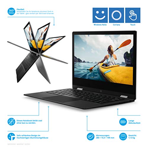 - Lieferumfang: MEDION AKOYA E2293 MD61130 Touch Convertible-Laptop, integrierter 2-Zellen Li-Polymer-Akku, externes Netzteil, Garantiekarte, Bedienungsanleitung