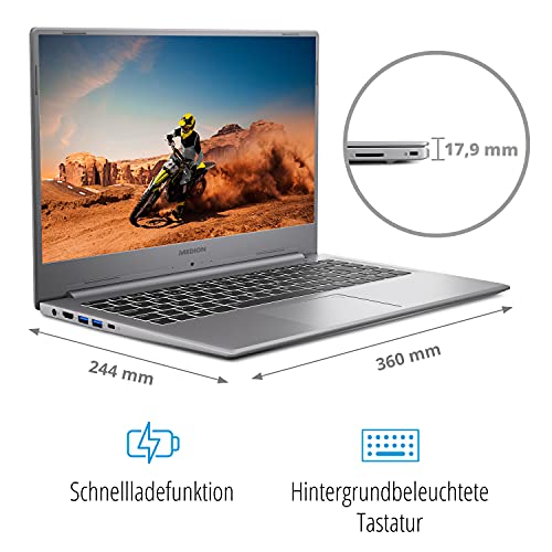 - Lieferumfang: MEDION AKOYA P15651 MD61933 Notebook, Integrierter 3-Zellen Li-Polymer-Akku* mit 42,6 Wh und bis zu 10,0 Stunden Akkulaufzeit, externes Netzteil, Schnellstartanleitung, Sicherheitshandbuch