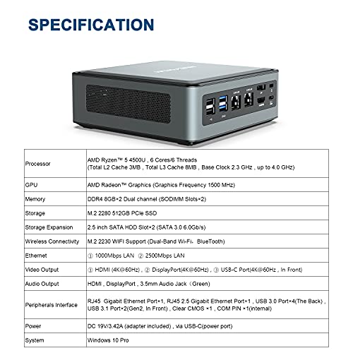 Mini PC AMD Ryzen 5 4500U up to 4.0 GHz | 16 GB RAM 512 GB PCIe SSD | Radeon Graphics | WIFI6 AX200 BT 5.1 | 4K HDMI/DP/USB-C | 2X RJ45| 4X USB 3.0 2X USB 3.1 Small Form Factor