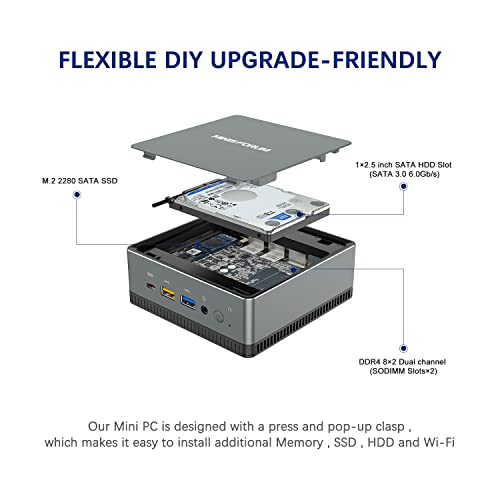 - 【 Große Kapazität】 Zweikanal-DDR4 16 GB RAM (2x 8 GB) und kann auf bis zu 64 GB aufgerüstet werden. 256 GB SSD. Sie können den 1X2,5-Zoll-SATA-HDD-Steckplatz verwenden, um den Speicher auf eine 2T-Speicherkapazität zu erweitern. Der MINI PC ist klein aber leistungsstark, Sparen Energie und Platz.