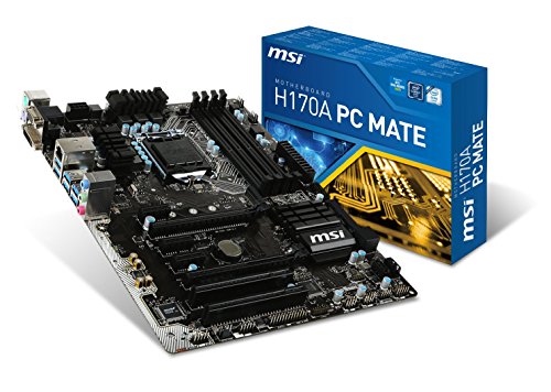 Brand MSI, Model H170A PC Mate CPU Socket Type LGA 1151, CPU Type Core i7 / i5 / i3 / Pentium / Celeron (LGA1151), Chipset Intel H170, Onboard Video Chipset Intel HD 5000/4000 Series, Number of Memory Slots 4×288pin, Memory Standard DDR4 2133/ 2400/ 2666/ 2800/ 3000 (2133+(OC, Maximum Memory Supported 64GB, Channel Supported Dual Channel, PCI Express 3.0 x16 2 (2 PCI-E 3.0; 16x+4x), PCI Express x1 3 x PCI Express x1, PCI Slots 2 x PCI Slots, SATA 6Gb/s 6 x SATA 6Gb/s, SATA Express 1, Audio Chipset Realtek ALC887, Audio Channels 8 Channels, LAN Chipset Realtek 8111H, Max LAN Speed 10/100/1000Mbps, Video Ports 1 x D-Sub, 1 x DVI , HDMI 1 x HDMI, USB 3.1 Type A (2 on Rear I/O), USB 3.0 4 x USB 3.0, USB 1.1/2.0 2 x USB 2.0, Onboard USB 4 x USB 3.0 + 2 x USB 2.0, Form Factor ATX,
