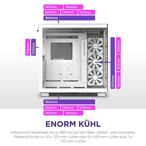 - ENORM KÜHL: Unterstützt Radiatoren bis zu 360mm in den oberen, seitlichen und unteren Panel. Passend für bis zu 10 x 120-mm-Lüfter oder 6 x 140-mm-Lüfter plus 1 x 120-mm-Lüfter