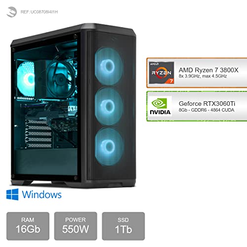 - Gaming PC, mit Prozessor 8-Core AMD Ryzen 7 3800X 8x 3.9GHz (max 4.5GHz) und Grafikkarte Geforce RTX 3060Ti 8Gb