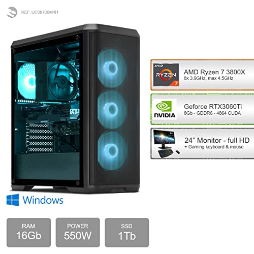 - Gaming PC, mit Prozessor 8-Core AMD Ryzen 7 3800X 8x 3.9GHz (max 4.5GHz) und Grafikkarte Geforce RTX 3060Ti 8Gb