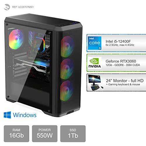 - Gaming PC, mit Prozessor 6-Core Intel Core i5-12400F 6x 2.50GHz (max 4.4GHz) und Grafikkarte Geforce RTX 3060 12Gb