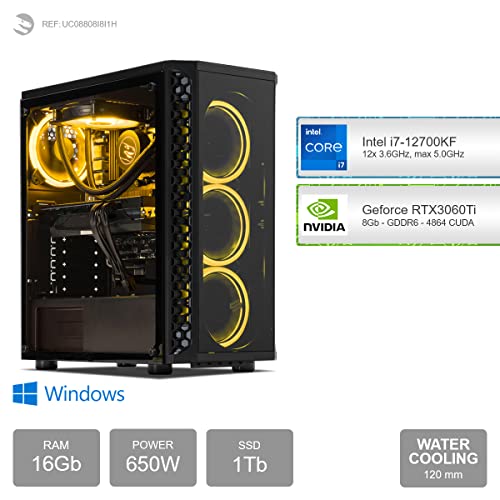 - Gaming PC, mit Prozessor 12-Core Intel Core i7-12700KF 12x 3.60GHz (max 5.0GHz) und Grafikkarte Geforce RTX 3060Ti 8Gb
