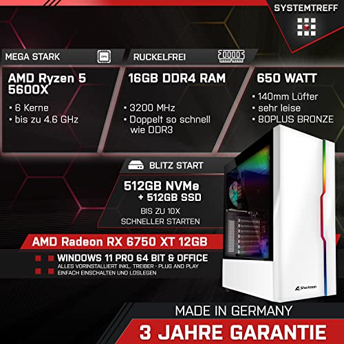 SYSTEMTREFF® High-End Gaming PC AMD Ryzen 5 5600X 6x4.6GHz | AMD Radeon RX 6750 XT | 512GB M.2 NVMe + 512GB SSD | 16GB DDR4 RAM | Windows 11 | Desktop Computer Rechner für Gamer, Zocker & Streamer