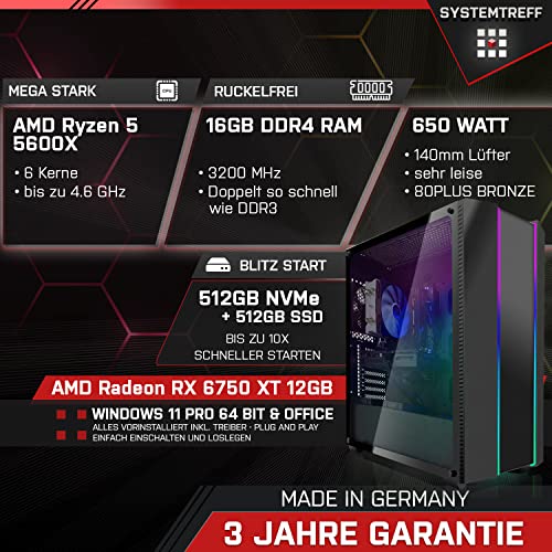 SYSTEMTREFF® High-End Gaming PC AMD Ryzen 5 5600X 6x4.6GHz | AMD Radeon RX 6750 XT | 512GB M.2 NVMe + 512GB SSD | 16GB DDR4 RAM | Windows 11 | Desktop Computer Rechner für Gamer, Zocker & Streamer