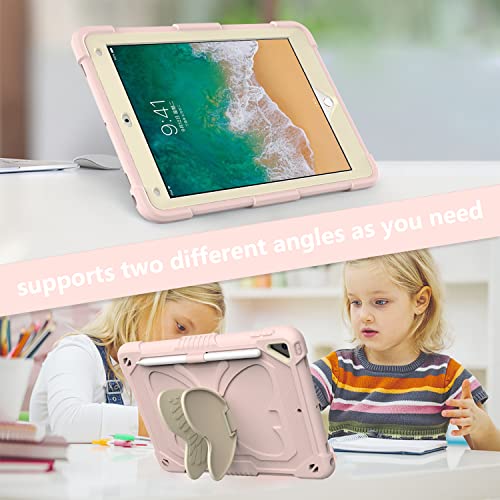 Tablet-Schutzhülle für iPad 2017 mit Schultergurt, Schutzhülle mit niedlichem beigefarbenem Schmetterling-Ständer für Kinder und Mädchen, Kinderhülle mit Stifthalter, Rose Pink