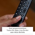 - Drücken und Alexa fragen – Du kannst einfach mit deiner Stimme deine Serien finden, Apps aufrufen, die Lautstärke einstellen und sogar kompatible Smart-Home-Geräte steuern.