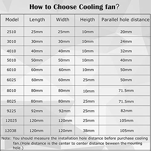 - 【80mm fan PRODUCT PARAMETERS】Dimensions: 80x80x10mm | 3.0 x 3.0 x 0.4inch | Voltage: DC 12V | Current: 0.13Amp | Power: 1.5Watt | Speed: 2200RPM | Airflow: 15CFM | Noise: 22dBA | Bearing: Sleeve | Long life with 35,000 Hrs