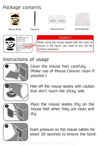 - PACKAGE CONTENT - 2 sets of mouse feet, tweezers, alcohol wipes and cleaning cloth. Easy to clean and install.【Note】Be sure to attach the round mouse feet to the round cover without logo G (due to the different thickness, attach mouse feet to the round cover with logo G may affect the mouse sensor response).[Note: Some models will be covered with a protective film, please remove it before use, otherwise it will not work normally.]