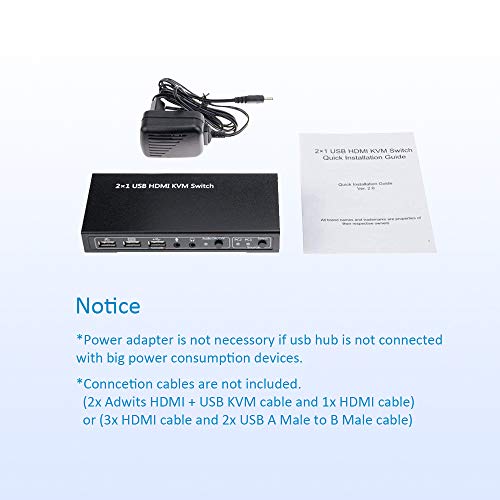 A ADWITS 2-Port 2-IN-1-OUT HDMI 4K@30Hz 1080P@60Hz 3D Ultra HD KVM Switch with Audio Switch, MIC, USB 2.0 Hub, UL Certified Safety Power Adapter, Windows Mac OS Linux PC Laptop Compatible