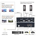 - 【 KVM SWITCH DUAL MONITOR】This kit help you use 1 set of keyboard and mouse to control 2 computers share 2 monitor, you can switch anytime. It requires each computer support 2 screen display functions. Highly recommend using a source with dual HDMI ports for use with this product, otherwise, that need VGA/DVI/ DP to HDMI convertor or docking station. Please choose the high quality devices, if the convertor/docking station is not good quality, it may lead to not display or reduce the resolution.