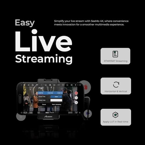 - Easy Live Streaming:Upgrated SeeMo 4K easily to realize Live-streaming with Accsoon SEE App"Live"function. Very lightweight design is a perfect tool to help you with professional video shooting outsides, simplifies live streaming with options for RTMP or SRT streaming, real-time LUT application, and a host of monitoring features