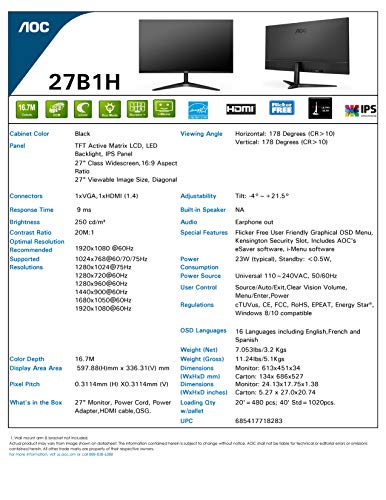AOC 27B1H 27" Full HD 1920x1080 Monitor, 3-Sided Frameless, IPS Panel, HDMI/VGA, Flicker-free