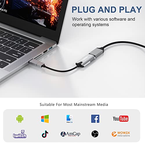 - 【Strong Compatibility】 This HDMI to USB C/3.0 video capture devices can be working on several Operating Systems and various software: Windows 7/ 8/ 10, Mac OS X 10.9 or above, Linux, Android, Laptop, 3DS, Xbox One, Camera, Webcame, DSLR, Nintendo Switch,PS4,PS5, TV BOX, HDTV, Potplayer/VLC ,OBS Studio etc. Easily streams to Facebook/ Youtube/ Twitch