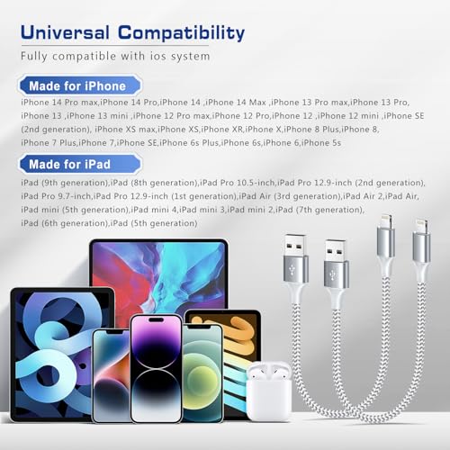- 【Universal Compatibility】:2Pack iPhone charger cable with iPhone 14/13/12/11/11 Pro/11 Pro Max/XS/XS Max/XR/X/8 Plus/8/7 Plus /7/Sync 6s Plus/6s/6 Plus/6/5s/5c/5/iPad Air / Air 2 iPad Mini / Mini 2 / Mini 3 /Mini iPad Pro 10.5 inch / 12.9 inch / 9.7 inch / iPad Pro, iPod Touch 5th gen, iPod nano 7th Gen