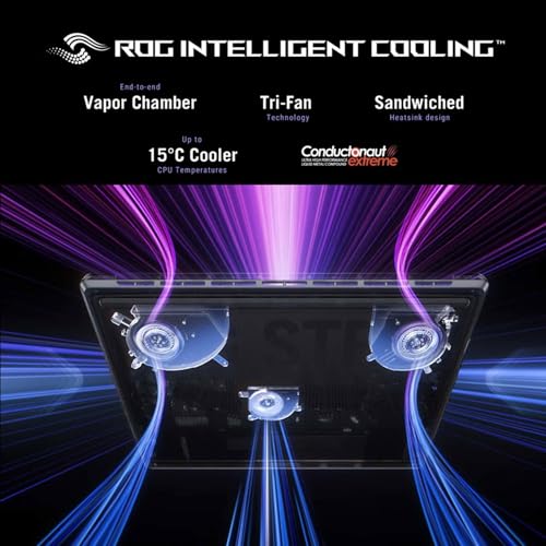 - STATE-OF-THE-ART ROG INTELLIGENT COOLING – ROG’s advanced thermals keep your system cool, quiet and comfortable. State of the art cooling equals best in class performance. Featuring an end-to-end vapor chamber, tri-fan technology and Conductonaut extreme liquid metal applied to the chipset delivers fast gameplay.