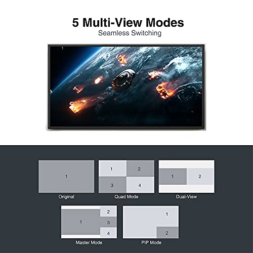 - 𝟓 𝐌𝐮𝐥𝐭𝐢-𝐕𝐢𝐞𝐰 𝐃𝐢𝐬𝐩𝐥𝐚𝐲 𝐌𝐨𝐝𝐞𝐬- Watch up to 4 shows simultaneously: The 4 in 1 out quad HDMI multi viewer supports 5 displays modes, including original mode, dual-view, master mode, PIP mode and quad mode. It supports seamless switching between 4 HDMI sources at original mode. ( Note: Audio supported: LPCM 2CH Only.) Plug and play, no driver needed.