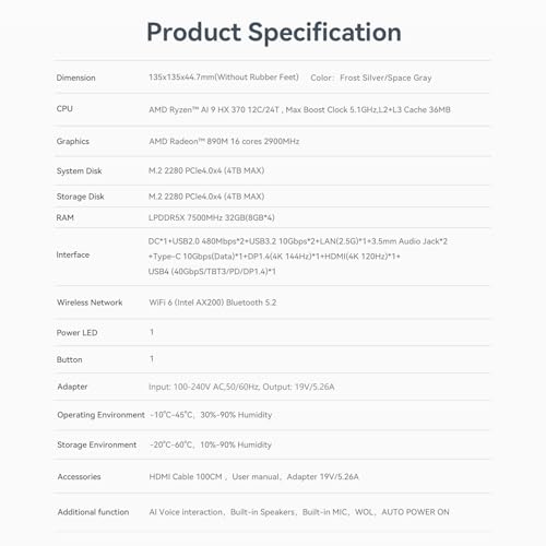 - š„ćPowerful Performance & AI VoicećBeelink SER9 Pro AI mini pc equips with 3rd Gen AMD AI PC Processor Ryzen AI 9 HX 370(12C/24T, up to 5.1GHz), Latest CPU Architecture Zen5, Total NPU+CPU+GPU AI Performance up to 80 TOPS, Fully upgraded CPU, GPU, and NPU architecture significantly boosts overall performance, delivering a faster, smarter, and more secure Al PC experience.The Built-in microphone is powered by an Al chip that supports smart audio pickup, which enables it to effectively separate voice command from background noise. 360° barrier-free voice recognition within 5 meters. The picked up audio is processed by an Al chip, making recorded vocals sound more natural and authentic.