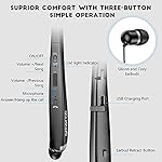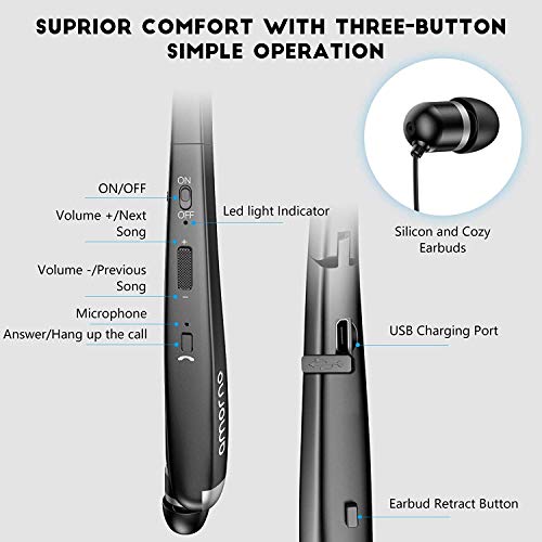 - [Neckband Design with retractable Earbuds]: Ergonomic neckband design, you can wear the headphone on your neck comfortably and perfectly, decrease the pressure of your ear, maximize the portability of listening music on the go. Auto retractable earbuds allows you to pull the retractable wire to the length you want and press the retract button can store the earbuds wire automatically.