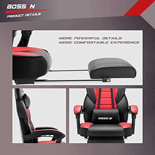 BOSSIN Racing Style Gaming Chair, Leather Computer Desk Chair with Footrest and Headrest, Ergonomic Heavy Duty Design, Large Size High-Back E-Sports, Big and Tall Gaming Chair (Red)