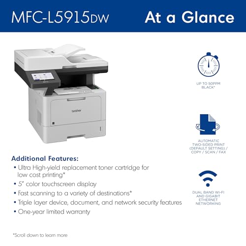 - FAST BUSINESS PRINTING AND COPYING: The Brother MFC-L5915DW business monochrome laser all-in-one printer delivers high-quality output and print and copy speeds of up to 50ppm(1) to help boost productivity and ensure fast, professional quality documents for busy offices.