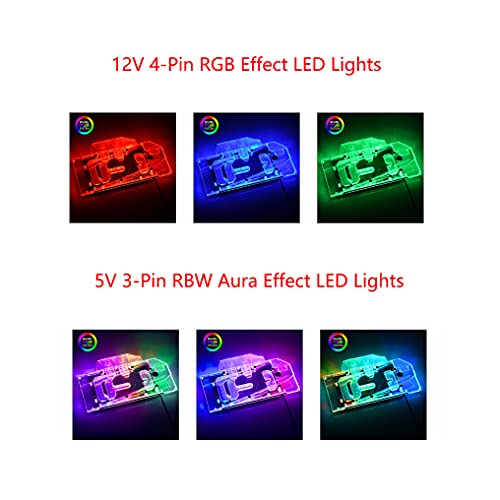 - 12V 4pin RGB LED lights color changeable addressable assembled GPU watercooling block. The 12V RGB lights can't show multi-color at the same time. Only 5V lights can do that as in the pictures. The remote control and integrate hub are included.