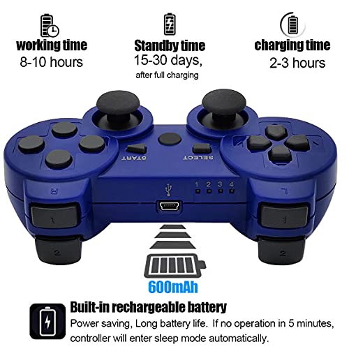 - Rechargeable PS3 controller built-in 600mAh rechargeable lithium battery. The ps3 wireless controller can be continuously used for about 8-10 hours after fully charged. It ensure hours of comfortable funny game playing. And 2-3h charging time is needed, standby time 15-30 days after full charging.