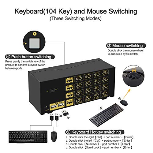 - 4. USB KVM Switch HDMI 4 Port: Four switching way optional: Hotkey switching(NumLock + NumLock + 1 / 2 / 3 / 4 + Enter, or Ctrl + Ctrl + 1 / 2 / 3 / 4 + Enter , or ScrollLock + ScrollLock + 1 / 2 / 3 / 4 + Enter), mouse switching(click mouse wheel 2 times + left button / right button), manual button switching, wired remote push button switching. Three display mode optional: Extended display, duplicate display, video-wall display.
